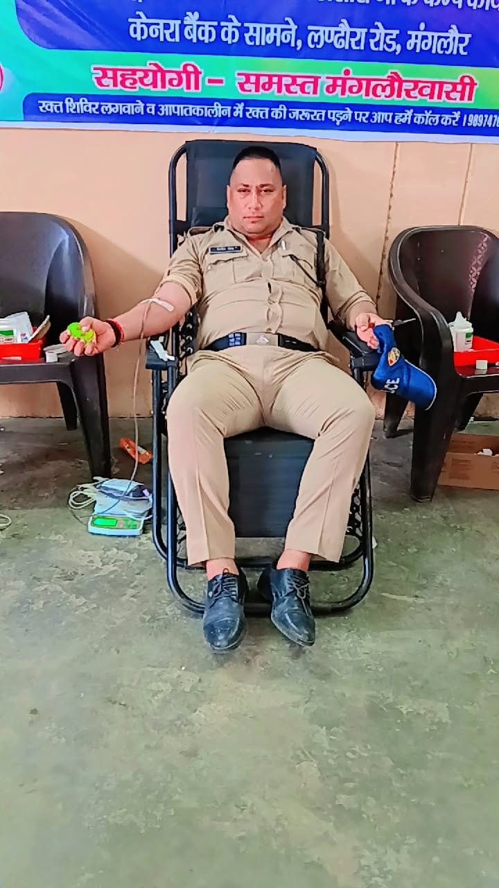 जनपद हरिद्वार पुलिस जनता और पुलिस के बीच विश्वास बढ़ाने की पहल लगातार करती रहती है पुलिस केवल क़ानून व्यवस्था बनाये जाने तक ही सिमित नहीं हैं बल्कि समाज कि सेवा में भी महत्वपूर्ण भूमिका निभानी पडती हैं। इसी क्रम में रविवार को मंगलौर क़स्बा चौकी प्रभारी सहित सिपाहियों ने रक्तदान कर समाज सेवा का संदेश दिया। रक्तदान करने के लिए चौकी प्रभारी बलबीर डोभाल, एएसआई गजपाल सिंह, हेड कॉन्सेटेबल एसबी यादव, सिपाही उत्तम,सिपाही मोहन कुमार, सिपाही विनोद कुमार, आदि ने रक्तदान किया। रक्तदान करते हुए बताया कि रक्तदान महादान है एक यूनिट रक्त से किसी कि जान बचाई जा सकती है. और सभी स्वस्थ व्यक्ति को नियमित रूप से रक्तदान करना चाहिए।