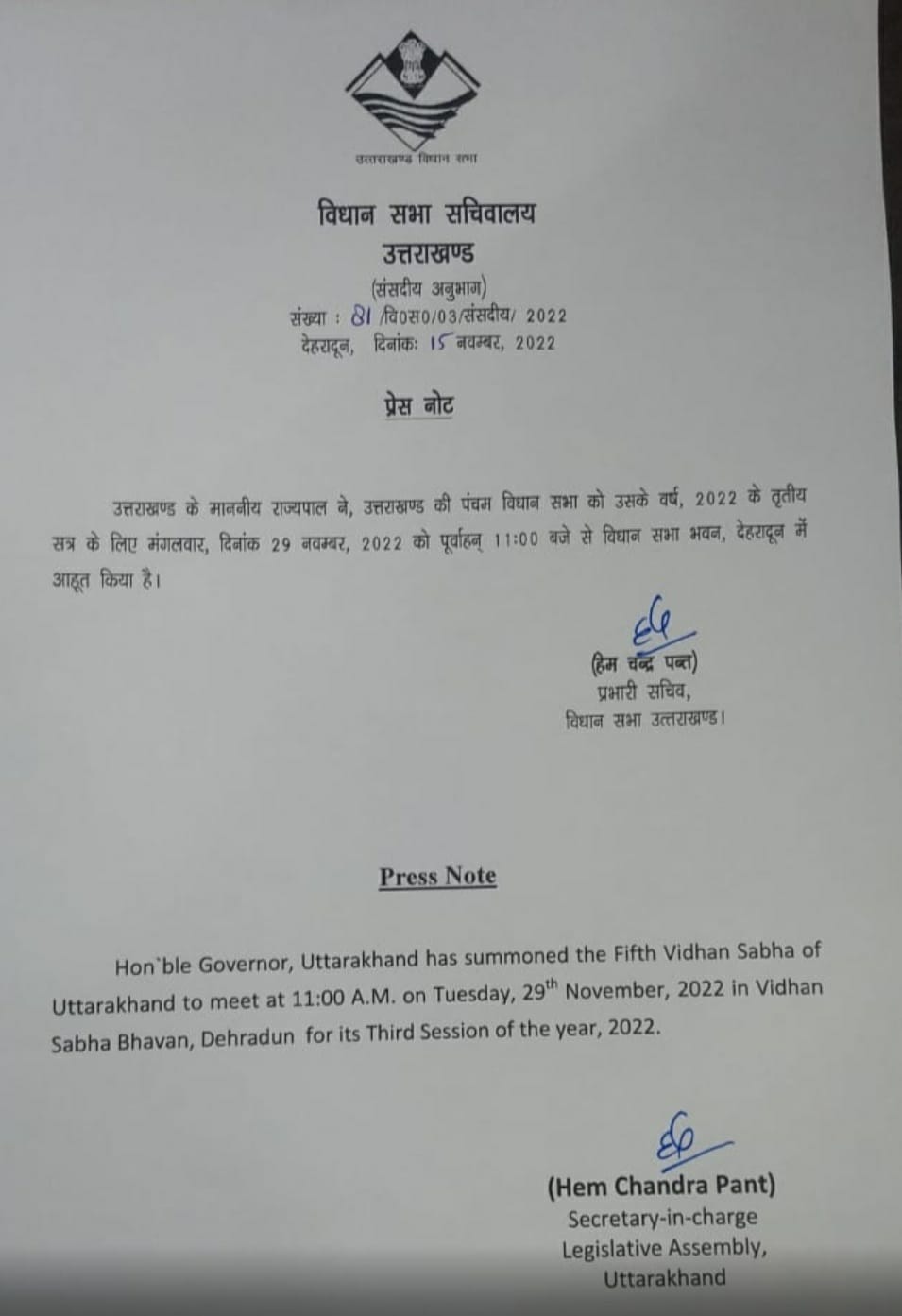 पाँचवी विधानसभा के 2022 के तृतीय सत्र की होगी कार्यवाही