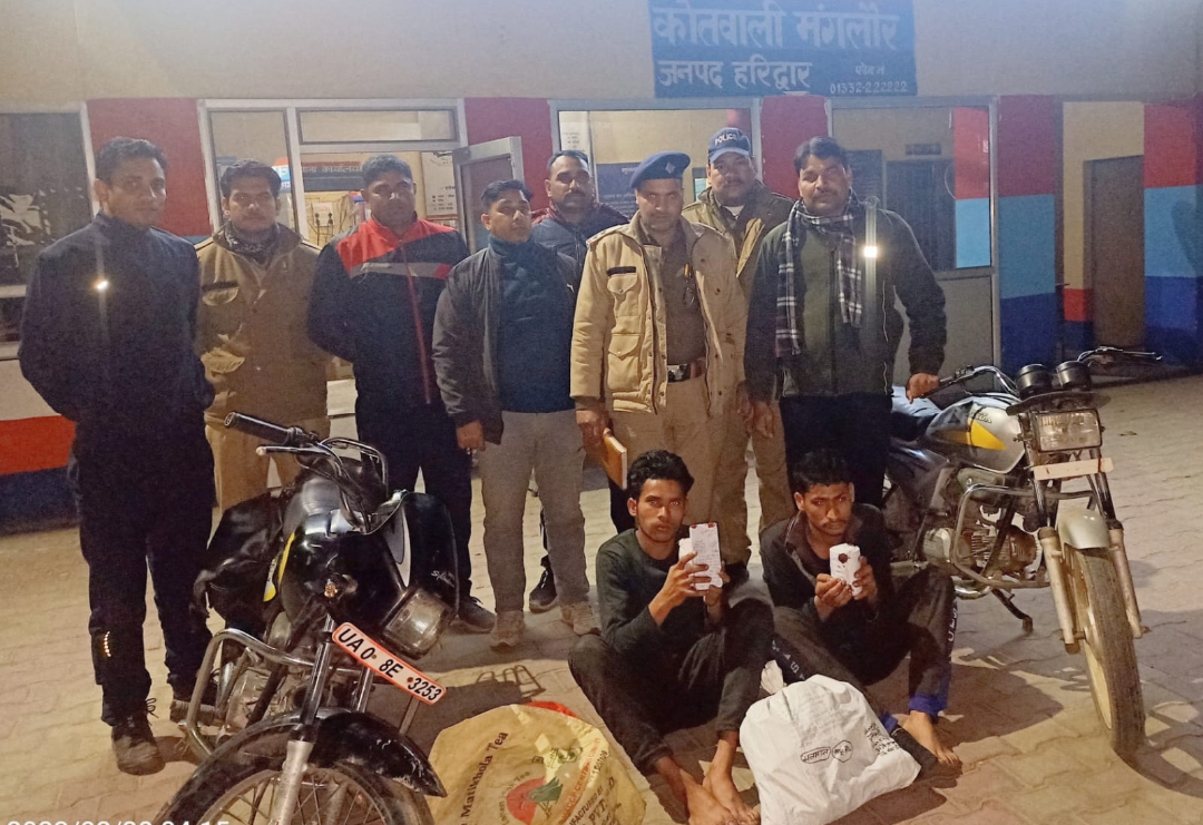 गोवंश स्क्वायड व मंगलौर कोतवाली की संयुक्त टीम ने प्रतिबंधित मांस के दो आरोपियों को गिरफ्तार किया है तथा दो आरोपी फरार बताए जा रहे हैं। पुलिस ने लगभग 250 किलोग्राम प्रतिबंधित मांस भी बरामद किया है। उत्तराखंड गोवंश संरक्षण स्क्वायड टीम को सूचना मिली की लाठर देवा शेख गांव में गन्ने के खेतों में कुछ व्यक्ति संरक्षित पशु का कटान कर रहे हैं। सूचना पाकर मंगलौर कोतवाली से उप निरीक्षक हाकम सिंह को लेकर गोवंश स्क्वाड टीम ने गन्ने के खेतों में दबिश दी। मौके से दो व्यक्ति आस मोहम्मद उर्फ आशु वह सलमान निवासी ग्राम नगला कुबड़ा को गिरफ्तार किया गया। जबकि दो आरोपी अंधेरे का फायदा उठाते हुए फरार हो गए। टीम ने मौके से लगभग 250 किलोग्राम प्रतिबंधित मांस व उपकरण भी बरामद किए। चारों आरोपियों के खिलाफ मंगलौर कोतवाली में गोवंश संरक्षण अधिनियम के अंतर्गत मुकदमा भी पंजीकृत कराया गया। फरार आरोपियों की पुलिस तलाश कर रही है। टीम में उप निरीक्षक आशीष कुमार, उप निरीक्षक शरद सिंह, उप निरीक्षक हाकम सिंह (कोतवाली मंगलौर), हेड कांस्टेबल सुनील सैनी, कॉन्स्टेबल परवीन सैनी, कांस्टेबल राजेंद्र, कॉन्स्टेबल तेजपाल शामिल रहे